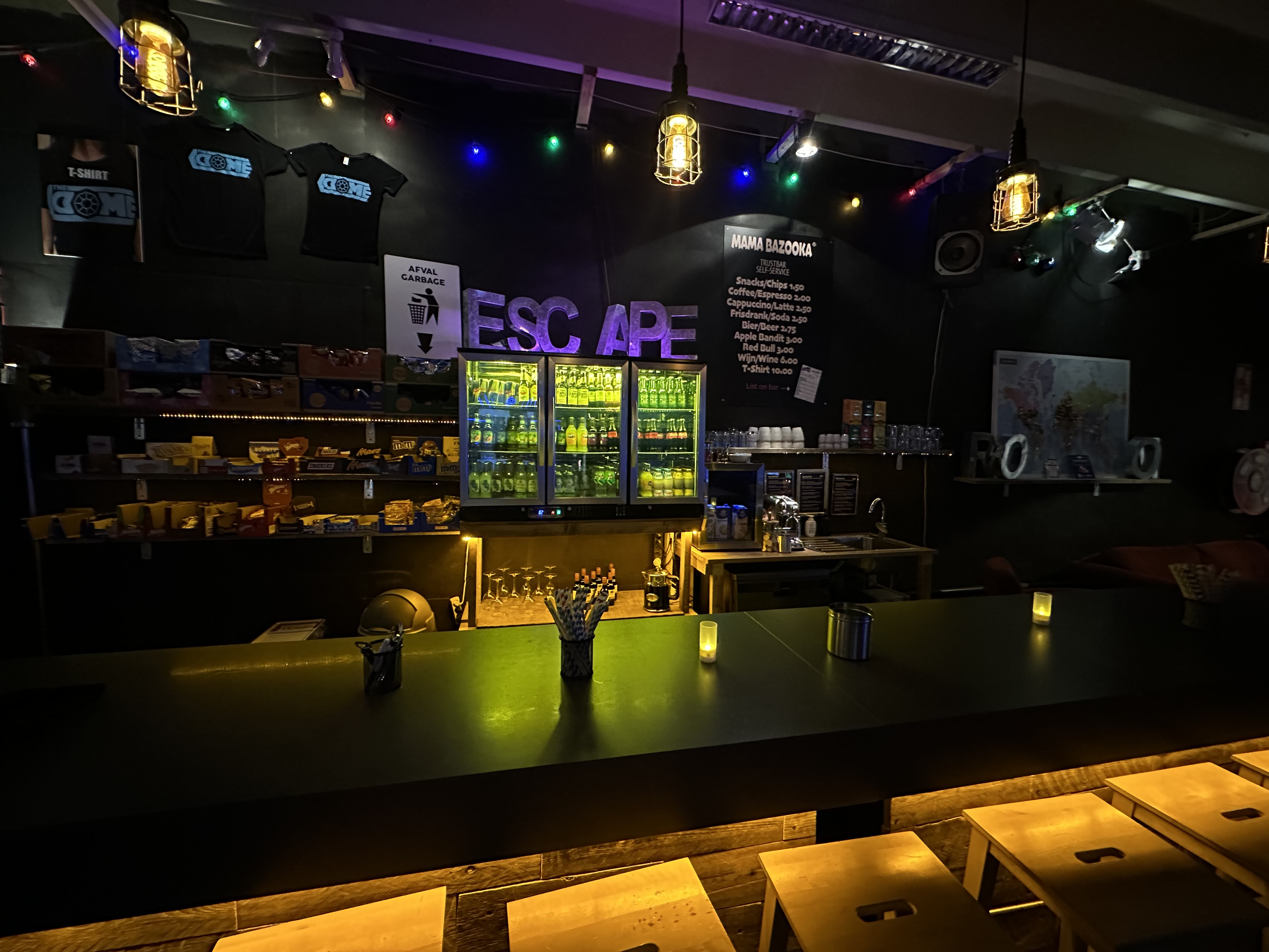 De game-lounge is onze sfeervolle ontvangstruimte met selfservice bar waar je voor en na de escape -of tussen verschillende escapes- kunt ontspannen, wat kunt drinken of spelletjes kunt doen; nintendo, playstation, sega, tafelvoetbal, tafeltennis, airhockey, darts, diverse bordspellen en sjoelen.